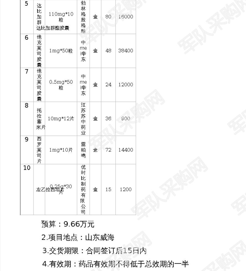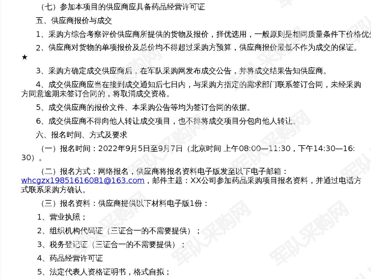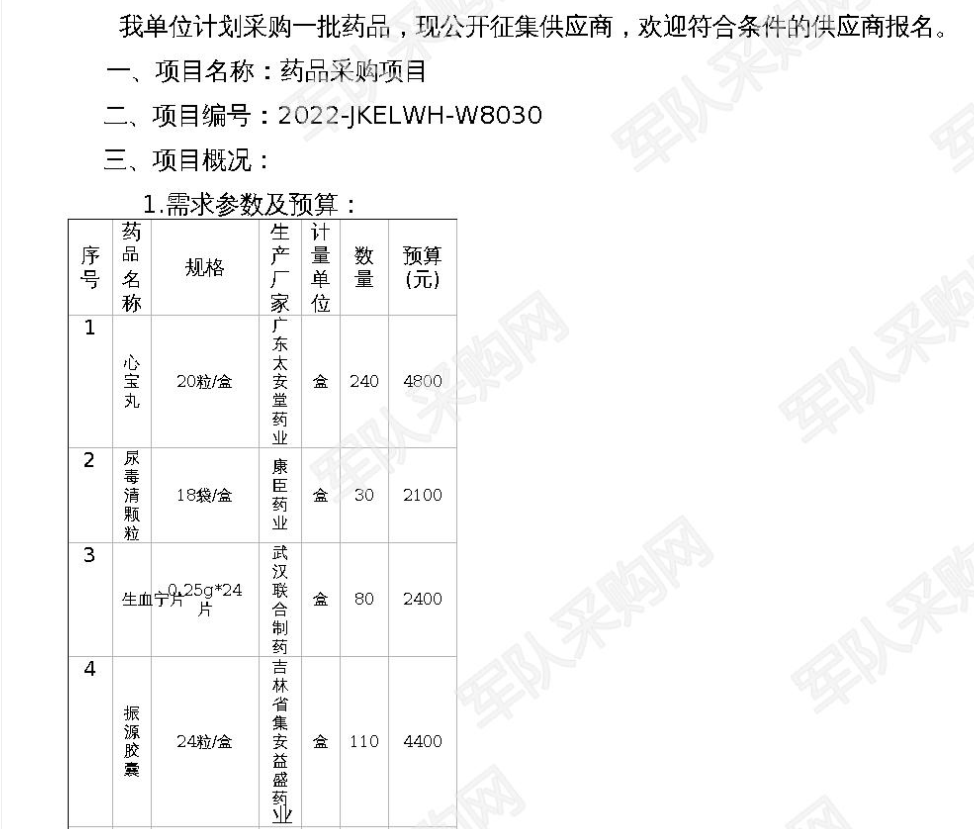 【军队采购网】药品采购项目采购公告(2022-JKELWH-W8030)