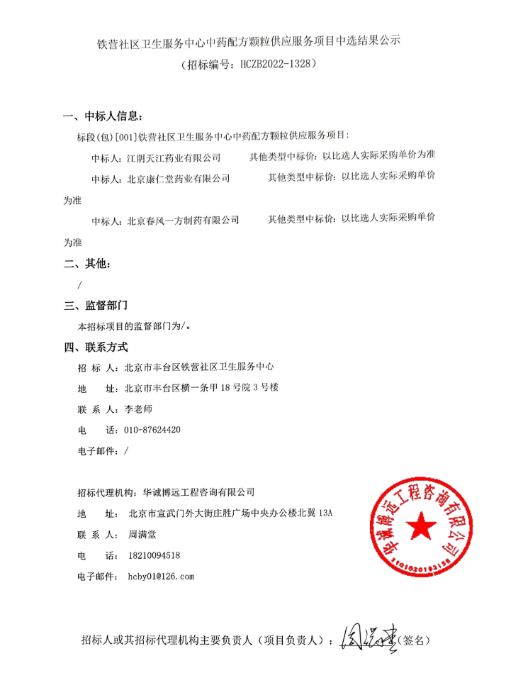 【北京市丰台区铁营社区卫生服务中心】北京市丰台区铁营社区卫生服务中心中药配方颗粒供应服务项目中选结果公示