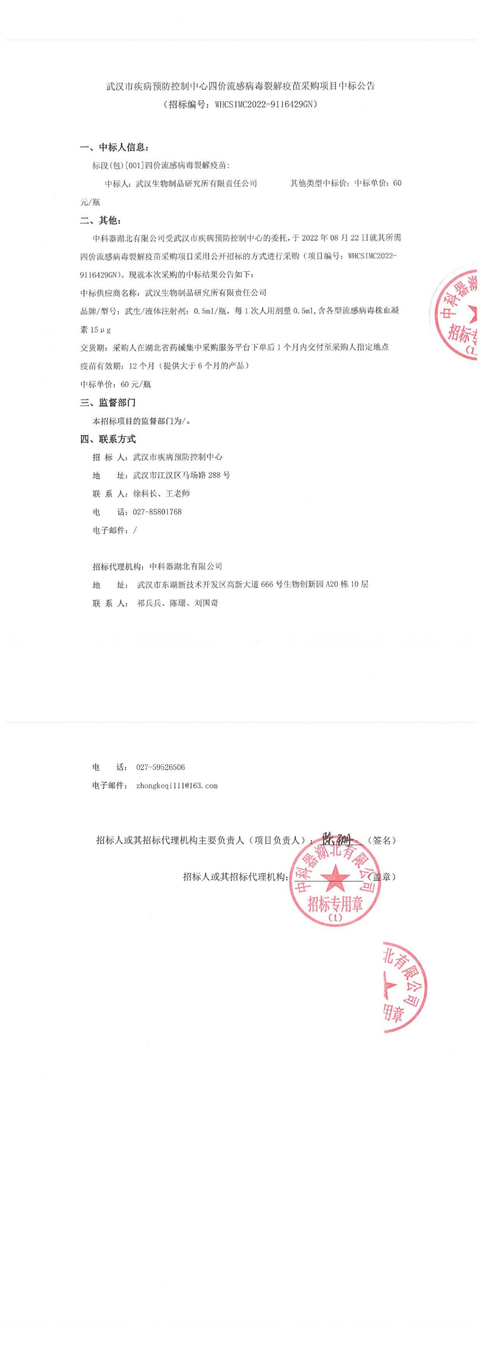【武汉市疾病预防控制中心】湖北省武汉市疾病预防控制中心四价流感病毒裂解疫苗采购项目中标公告