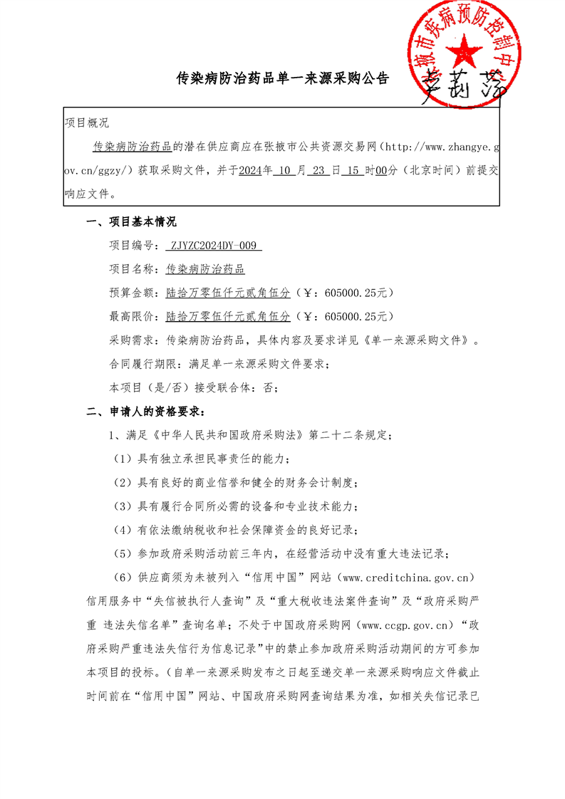 【张掖市疾病预防控制中心】甘肃省张掖市传染病防治药品单一来源采购公告