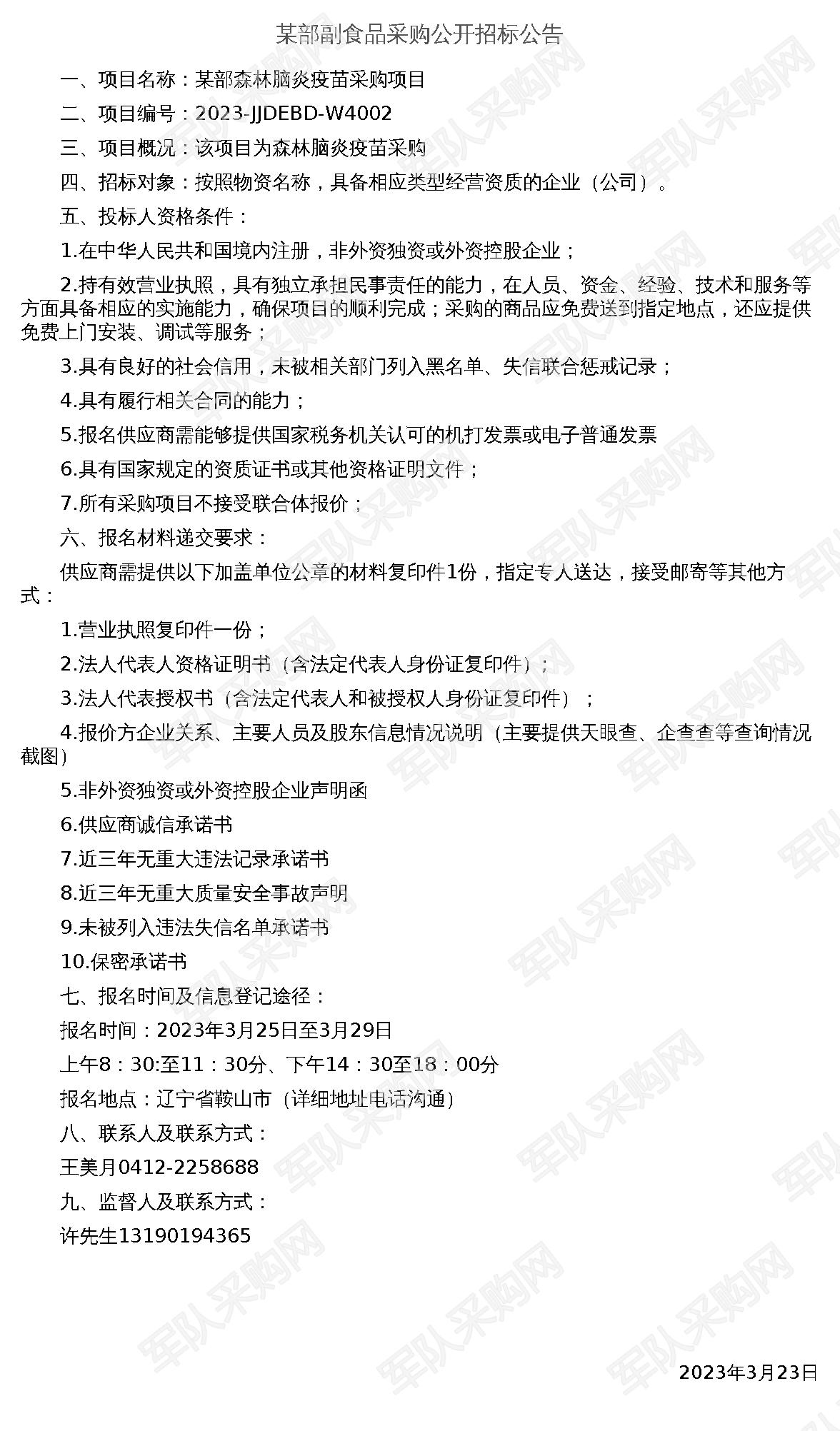 【军队采购】军队采购网某部森林脑炎疫苗采购项目2023-JJDEBD-W4002
