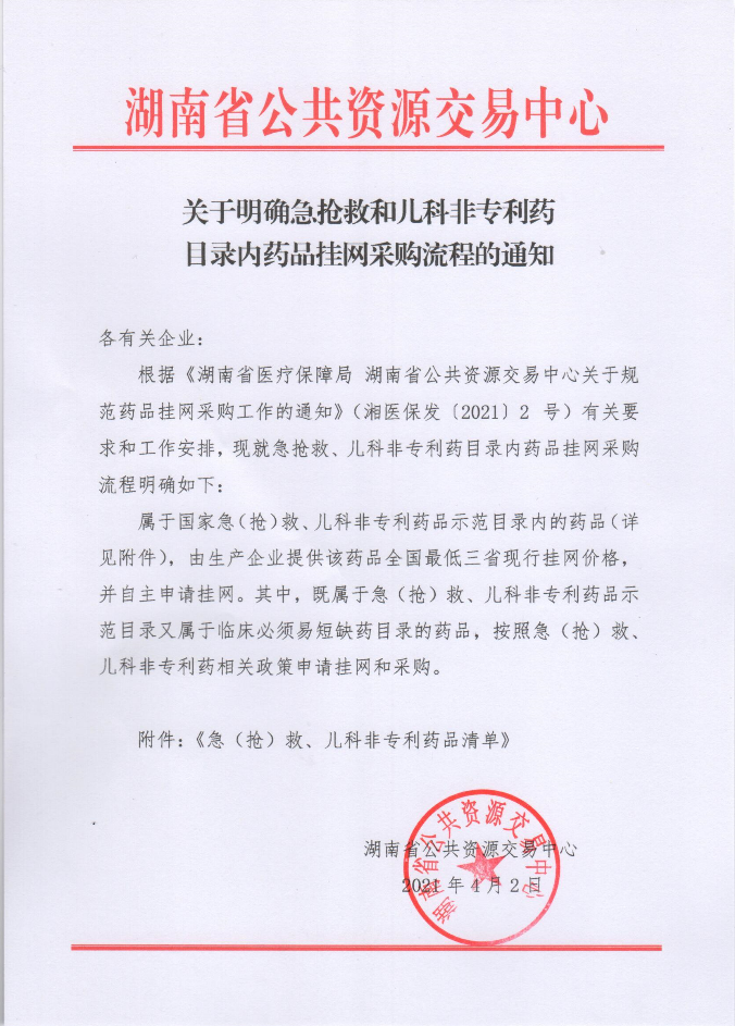 【湖南】2021年湖南省关于明确急抢救药和儿科非专利药目录内药品挂网采购流程的通知