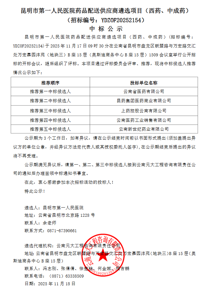 【昆明市第一人民医院】云南省〔昆明市第一人民医院药品配送供应商遴选项目(西药、中成药)〕中标公示