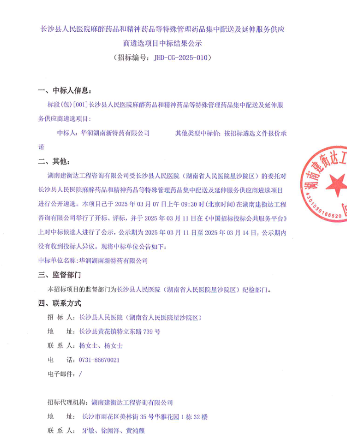 【长沙市长沙县人民医院】湖南省长沙市长沙县人民医院麻醉药品和精神药品等特殊管理药品集中配送及延伸服务供应商遴选项目中标结果公示