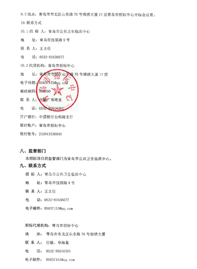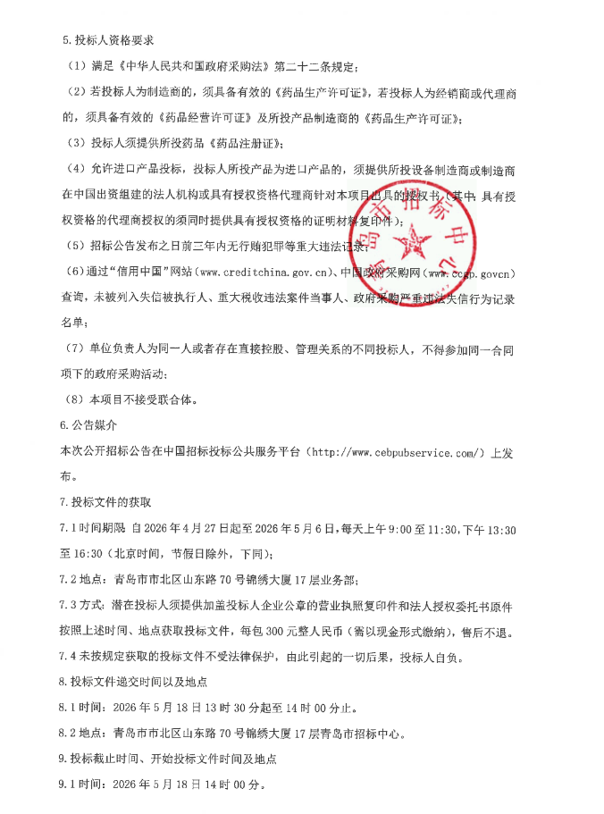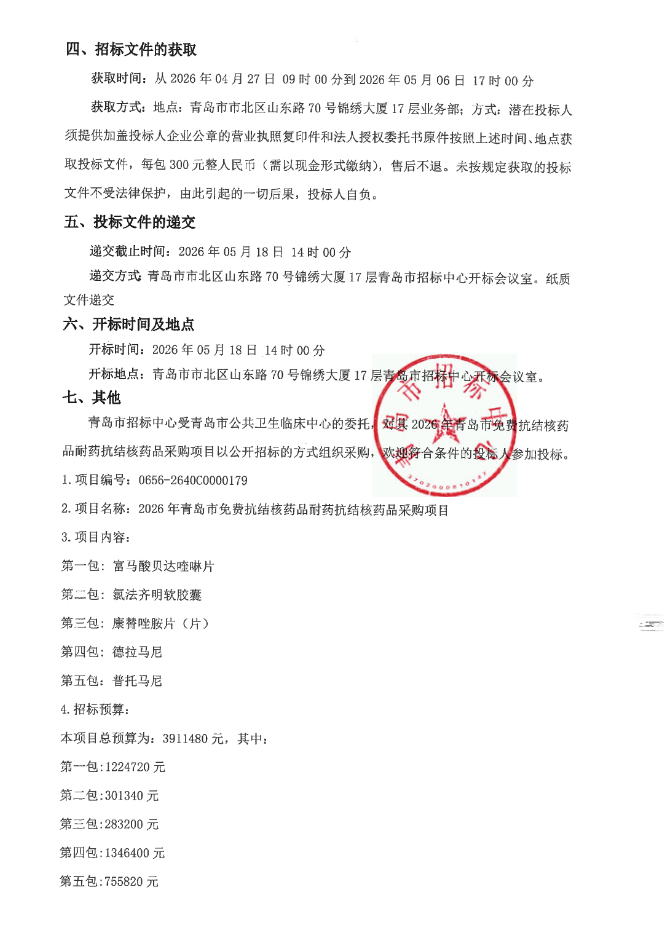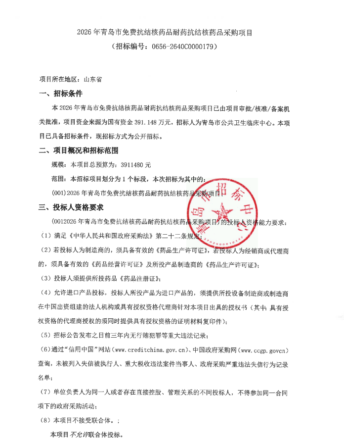 【青岛市公共卫生临床中心】山东省2026年青岛市免费抗结核药品耐药抗结核药品采购项目