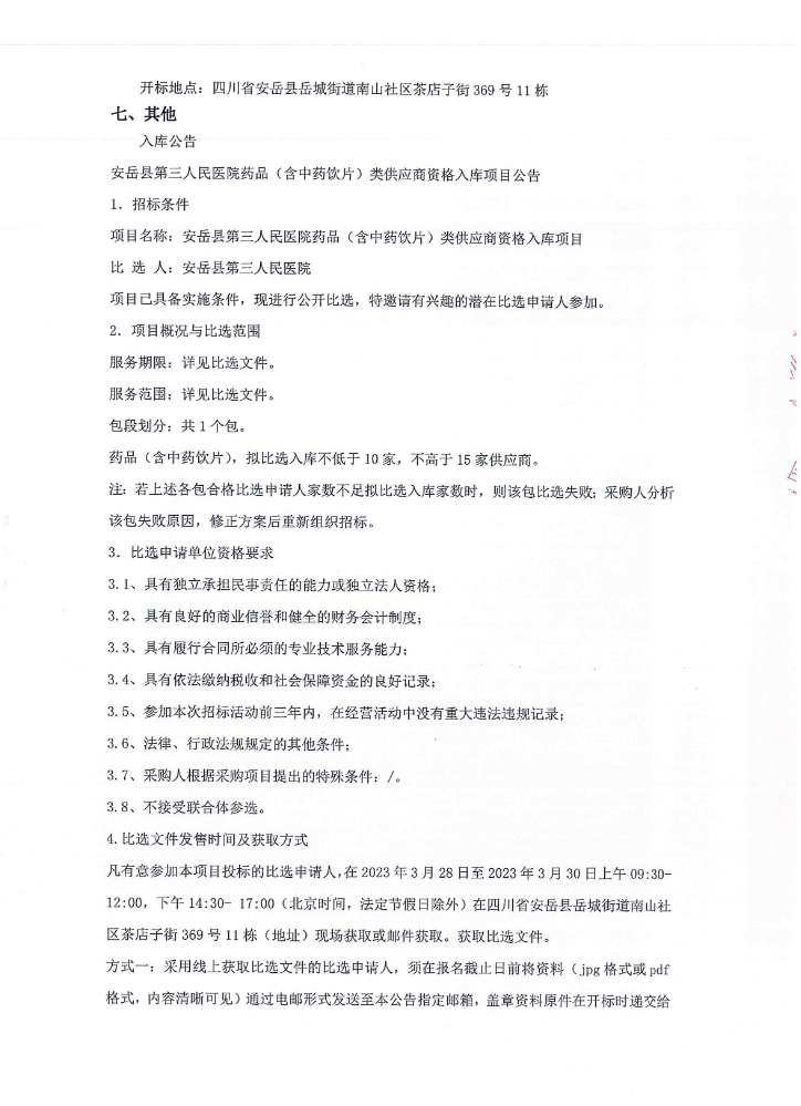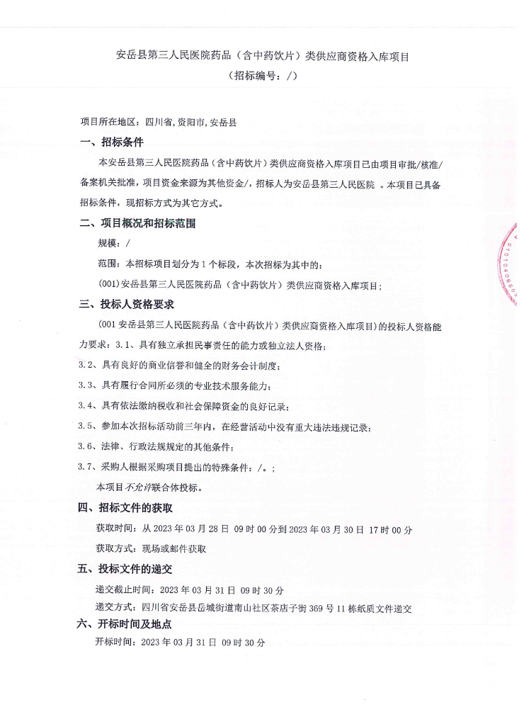【资阳市安岳县第三人民医院】四川省资阳市安岳县第三人民医院药品(含中药饮片)类供应商资格入库项目