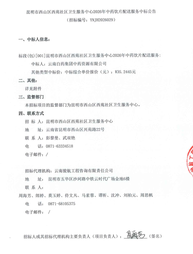 【昆明市西山区西苑社区卫生服务中心】云南省昆明市西山区西苑社区卫生服务中心2026年中药饮片配送服务中标公告