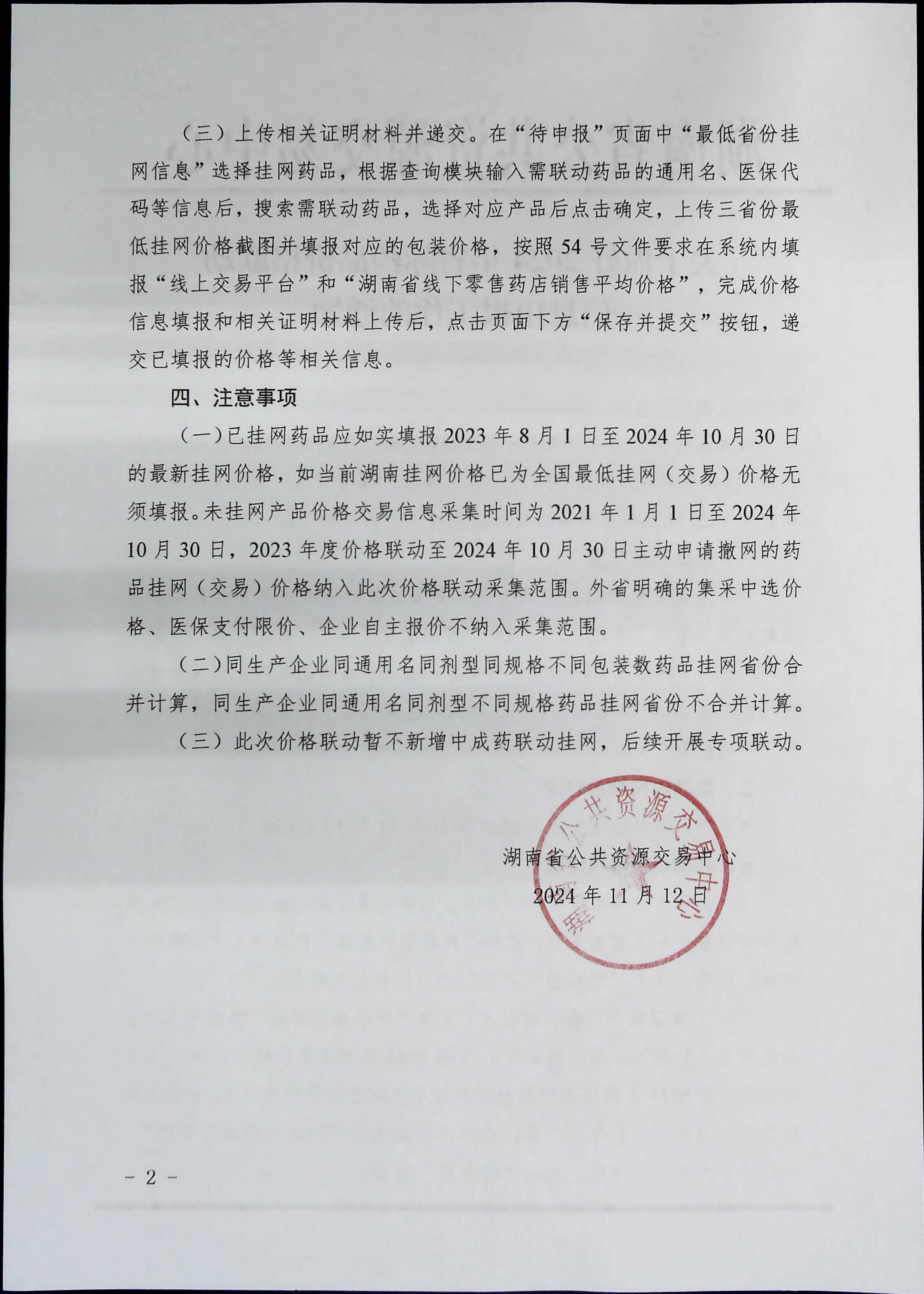 根据湖南省医保局《关于开展2024年省际药品价格联动挂网工作的通知》(湘医保函(2024)54号,以下简称“54号文件”)的有关要求,现就做好2024年省际药品价格联动申报工作通知如下: