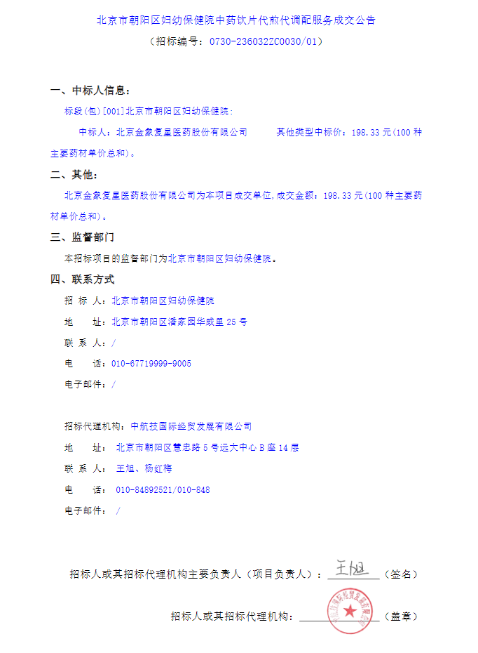 【北京市朝阳区妇幼保健院】北京市朝阳区妇幼保健院中药饮片代煎代调配服务成交公告