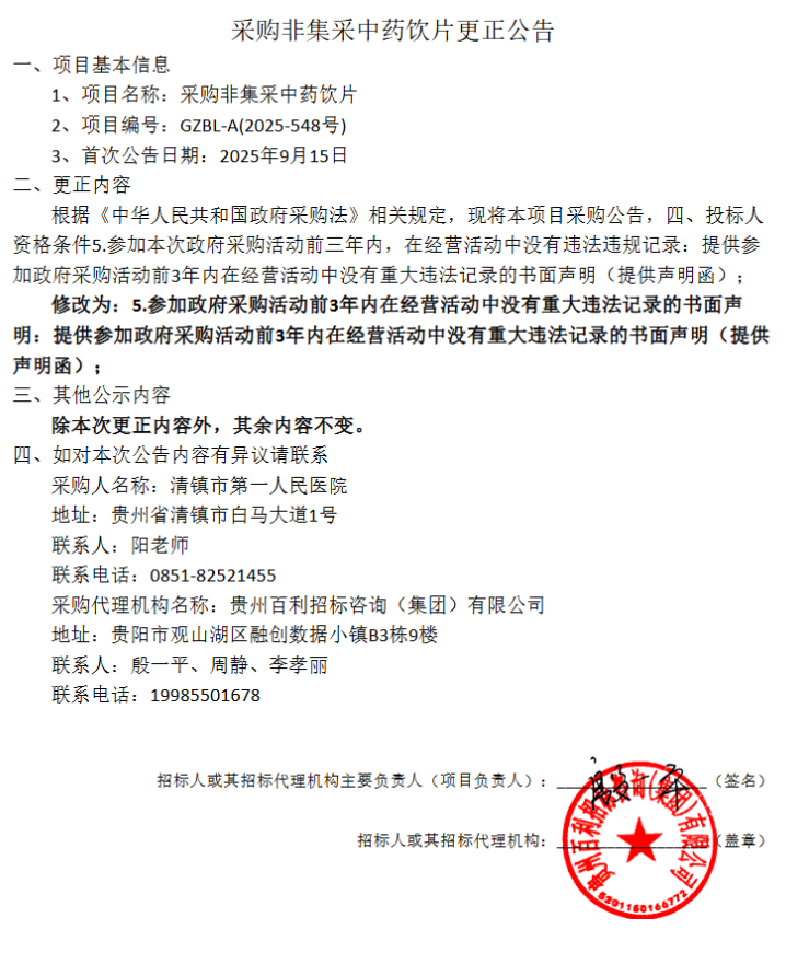 【贵阳市清镇市第一人民医院】贵州省清镇市第一人民医院采购非集采中药饮片更正公告