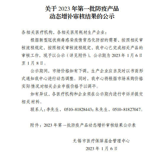根据新型冠状病毒感染疫情常态化防控的需要,按照相关审核流程规定,按照相关审核流程规定,我中心已完成相关产品的审核工作,现予以公示(详见附件),公示期为2023年1月6日至1月8日。