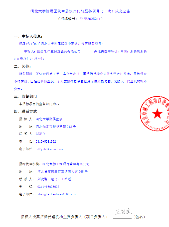 【河北大学附属医院】河北大学附属医院中药饮片代煎服务项目(二次)成交公告