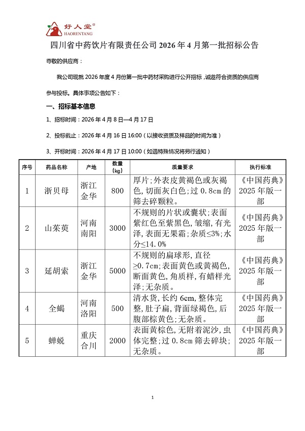 【四川省中药饮片有限责任公司】四川省中药饮片有限责任公司4月第一批招标公告