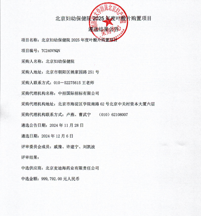 【北京妇幼保健院】北京妇幼保健院2025年度叶酸片购置遴选结果公告