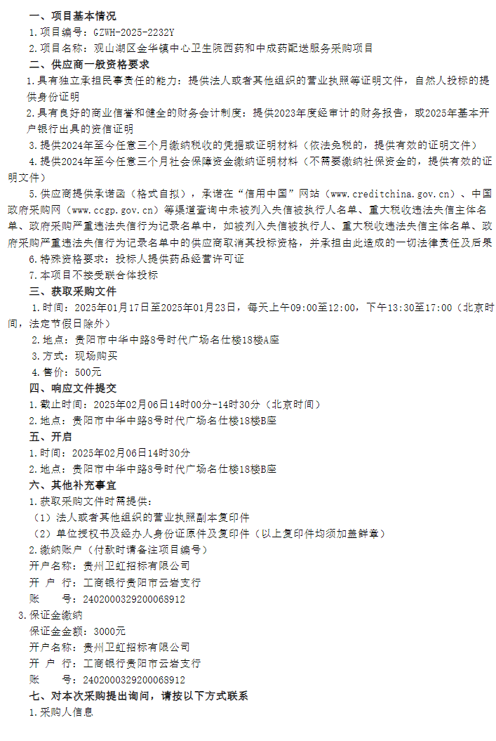 【贵阳市观山湖区金华镇中心卫生院】贵州省贵阳市观山湖区金华镇中心卫生院西药和中成药配送服务采购项目竞争性磋商公告(20250117)