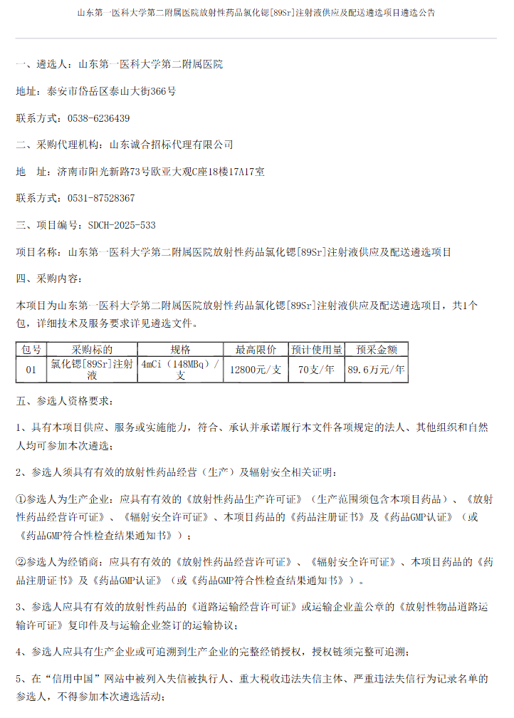 【山东第一医科大学第二附属医院】山东第一医科大学第二附属医院放射性药品氯化锶[89Sr]注射液供应及配送遴选项目遴选公告