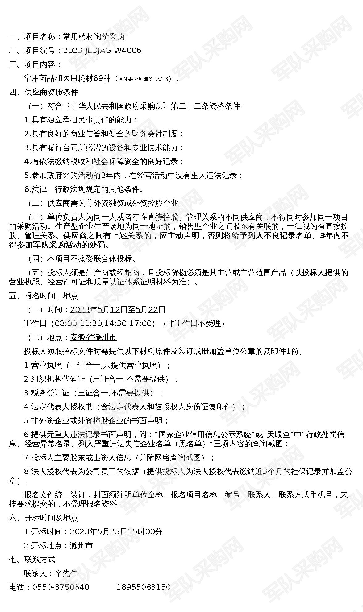 【军队采购】军队采购网常用药材询价公告(2023-JLDJAG-W4006)