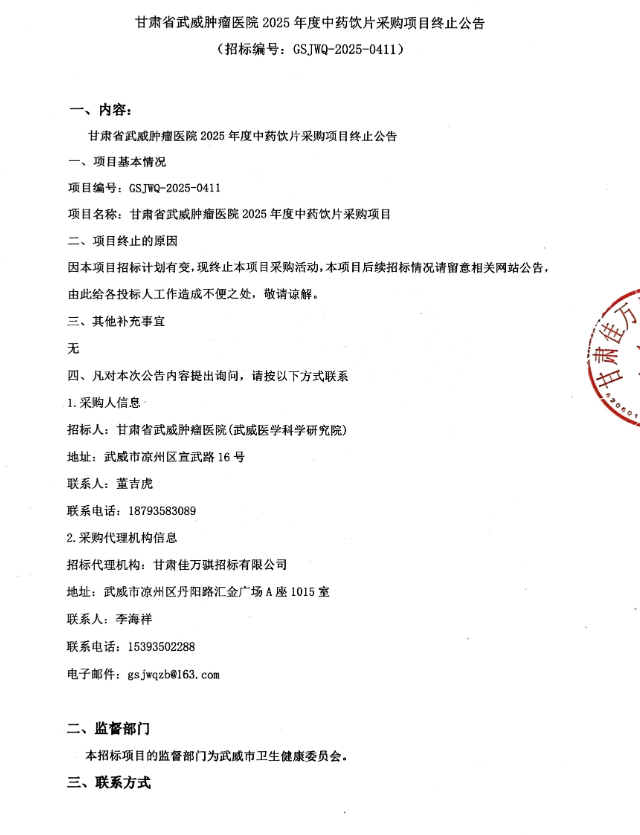 【武威肿瘤医院】甘肃省武威肿瘤医院2025年度中药饮片采购项目终止公告