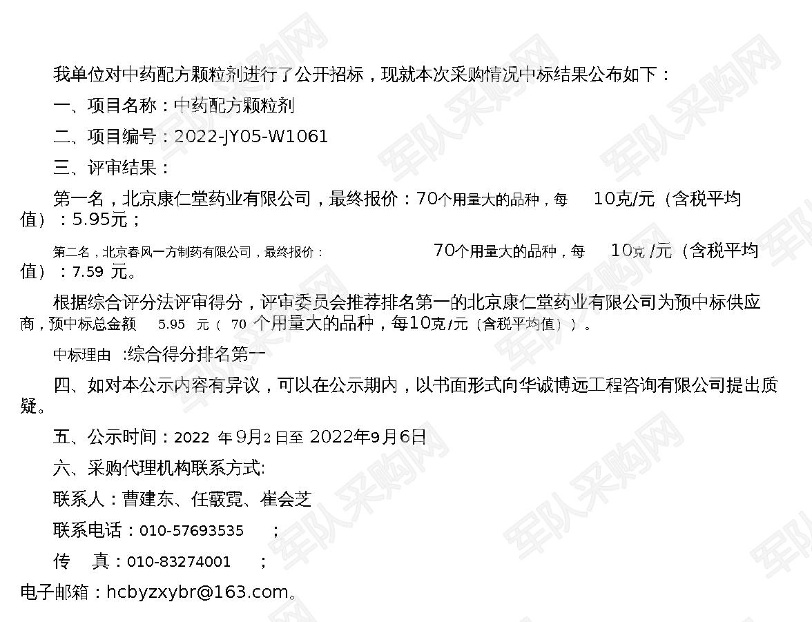 【军队采购网】中药配方颗粒剂中标公示(2022-JY05-W1061)