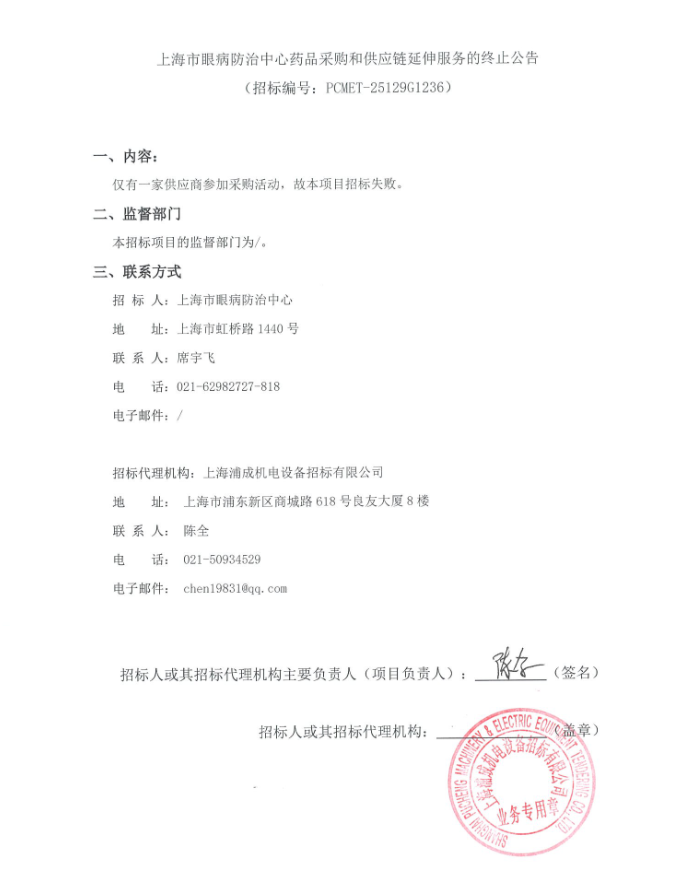 【上海市眼病防治中心】上海市眼病防治中心药品采购和供应链延伸服务的终止公告
