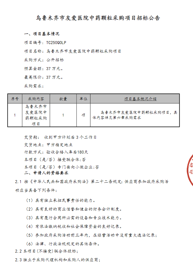 【乌鲁木齐市友爱医院】新疆维吾尔自治区乌鲁木齐市友爱医院中药颗粒采购项目-招标公告