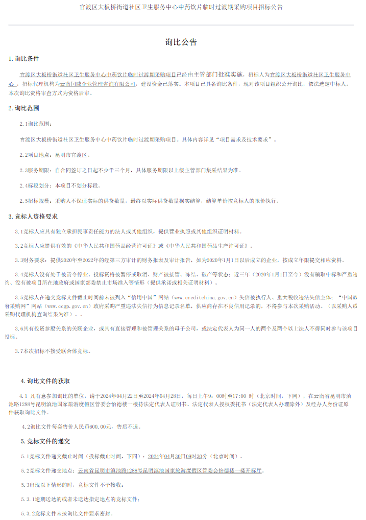 【昆明市官渡区大板桥街道社区卫生服务中心】云南省昆明市官渡区大板桥街道社区卫生服务中心中药饮片临时过渡期采购项目招标公告