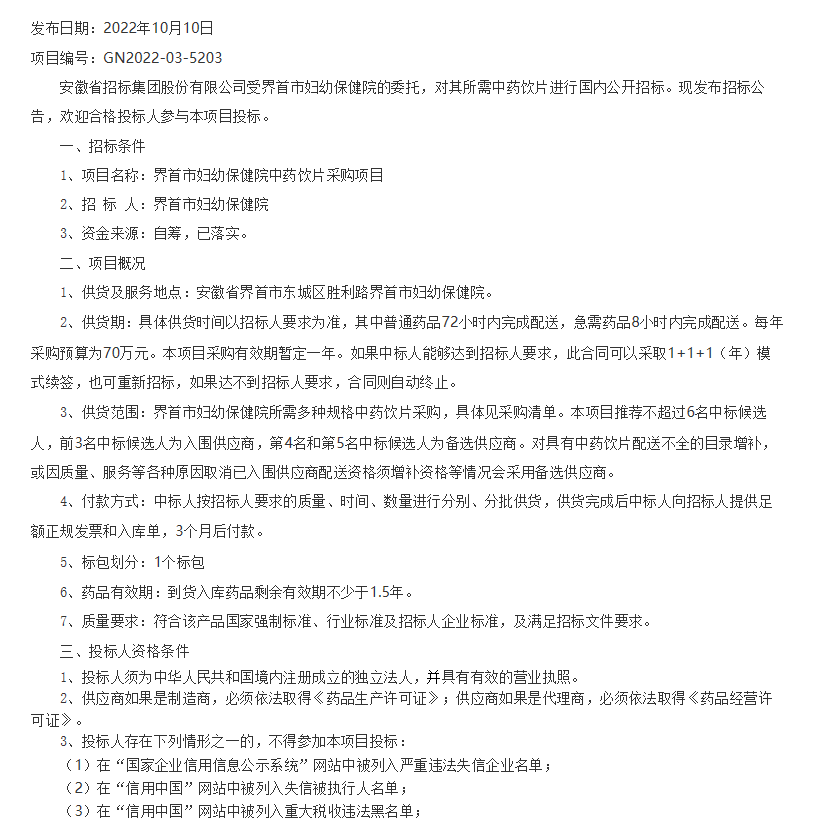 【安徽省阜阳市界首市妇幼保健院】中药饮片采购项目招标公告