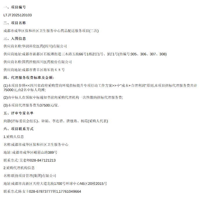 【成都市成华区保和社区卫生服务中心】四川省成都市成华区保和社区卫生服务中心药品配送服务项目(二次)公开招标中标公告