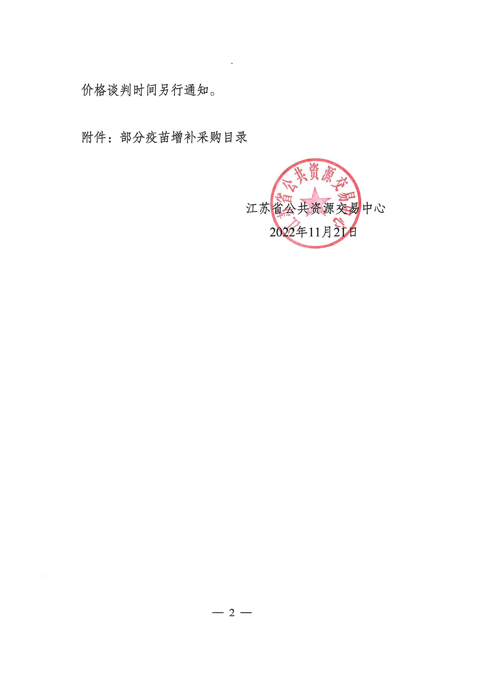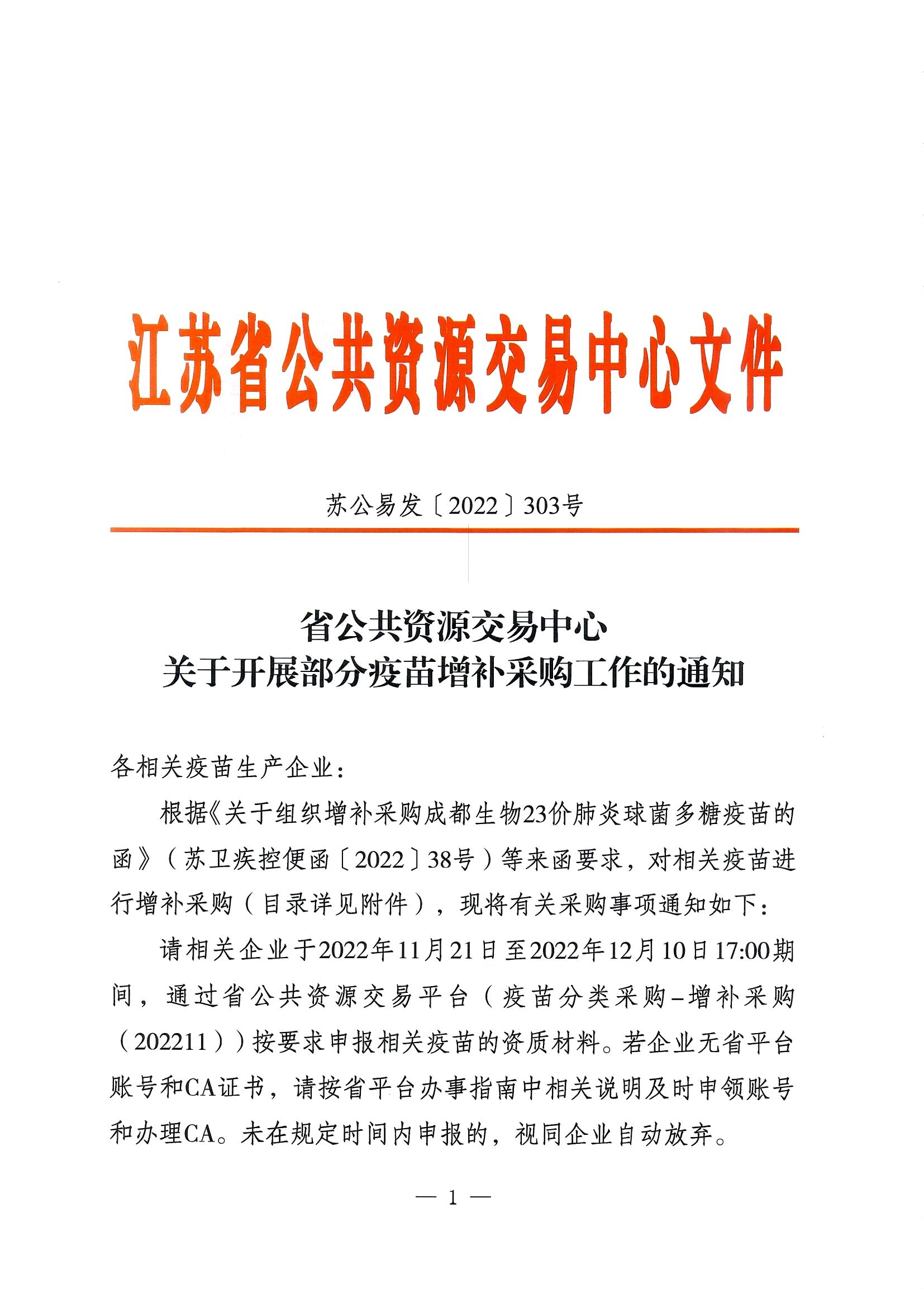 根据《关于组织增补采购成都生物23价肺炎球菌多糖疫苗的函》(苏卫疾控便函〔2022〕38号)等来函要求,对相关疫苗进行增补采购(目录详见附件),现将有关采购事项通知如下∶