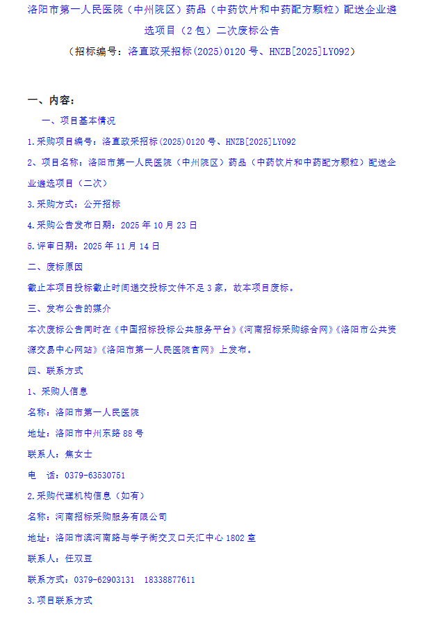 【洛阳市第一人民医院】河南省洛阳市第一人民医院(中州院区)药品(中药饮片和中药配方颗粒)配送企业遴选项目(2包)二次废标公告