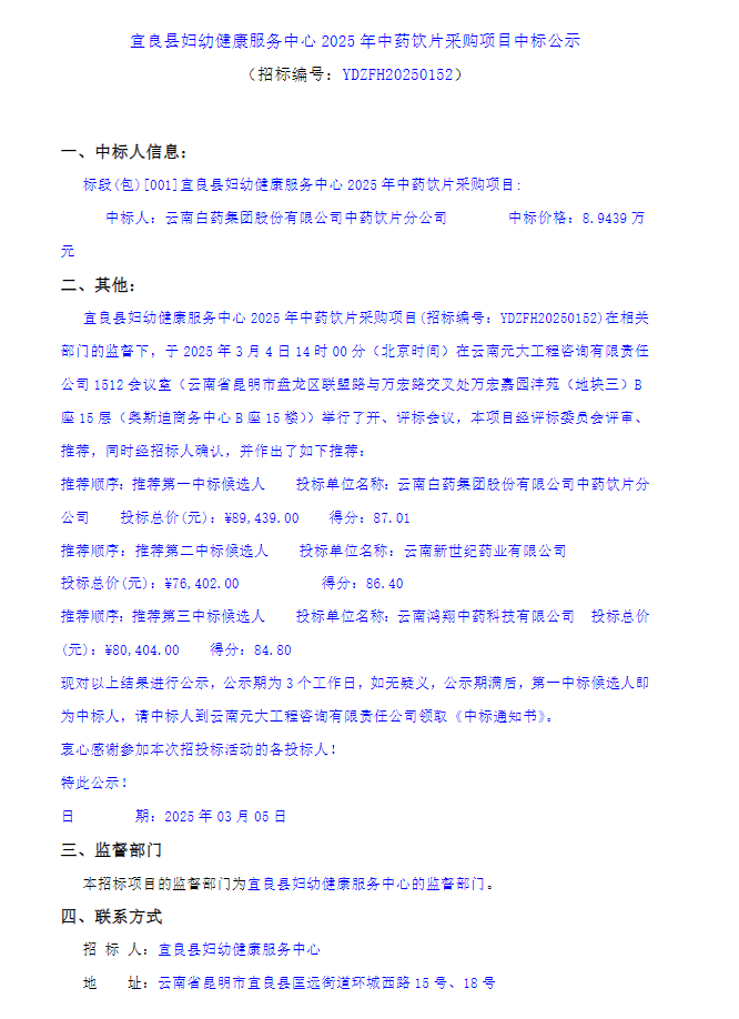 【昆明市宜良县妇幼健康服务中心】云南省昆明市宜良县妇幼健康服务中心2025年中药饮片采购项目中标公示