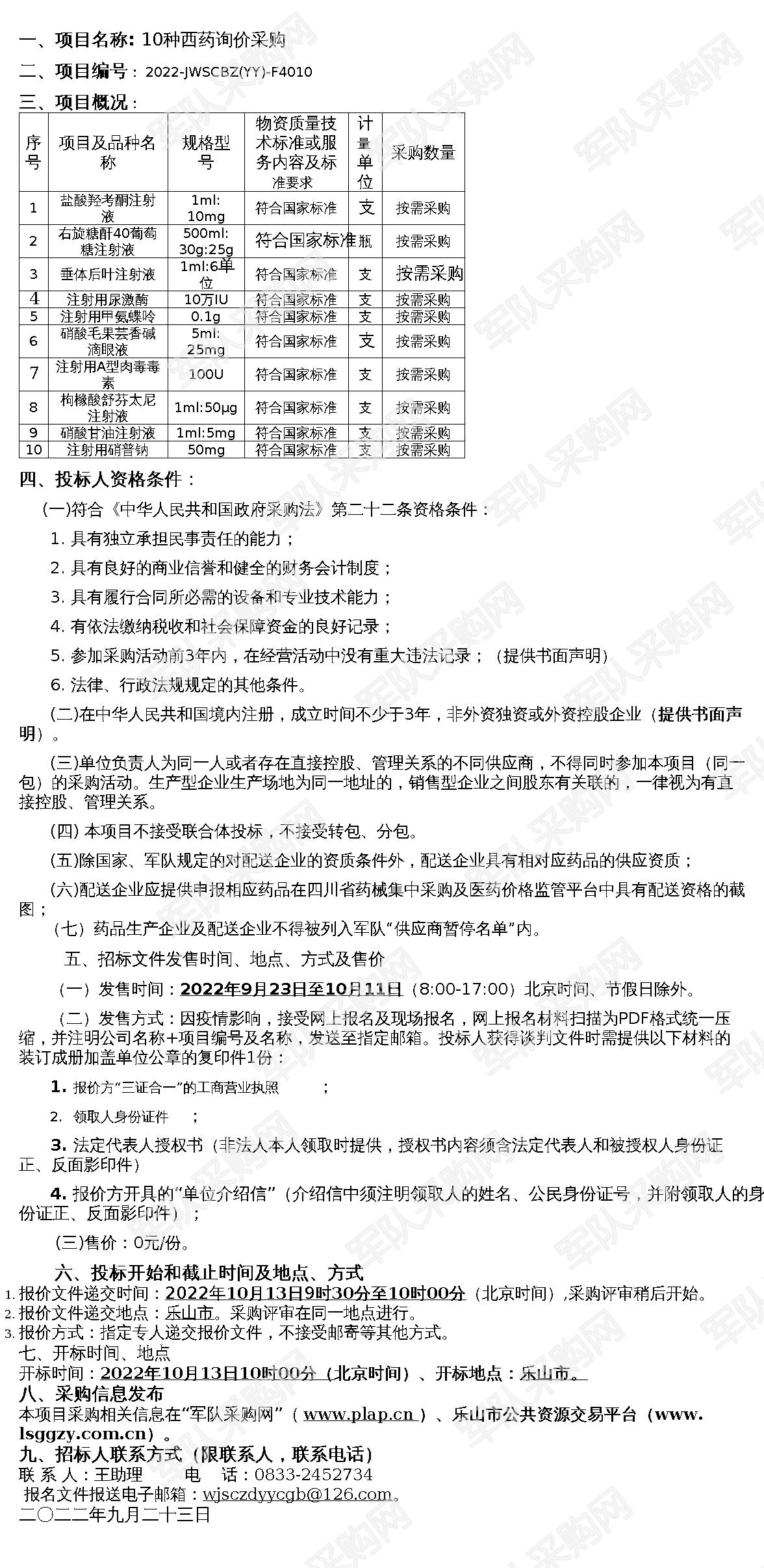 【军队采购网】10种西药询价采购项目公告(2022-JWSCBZ(YY)-F4010)