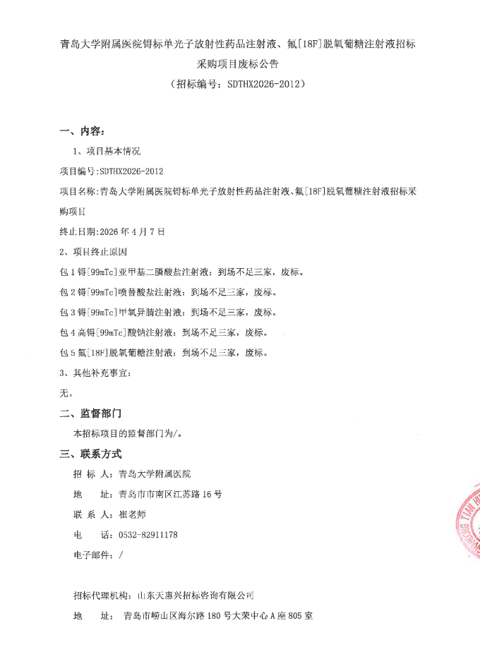 【青岛大学附属医院】山东省青岛大学附属医院锝标单光子放射性药品注射液、氟[18F]脱氧葡糖注射液招标采购项目废标公告