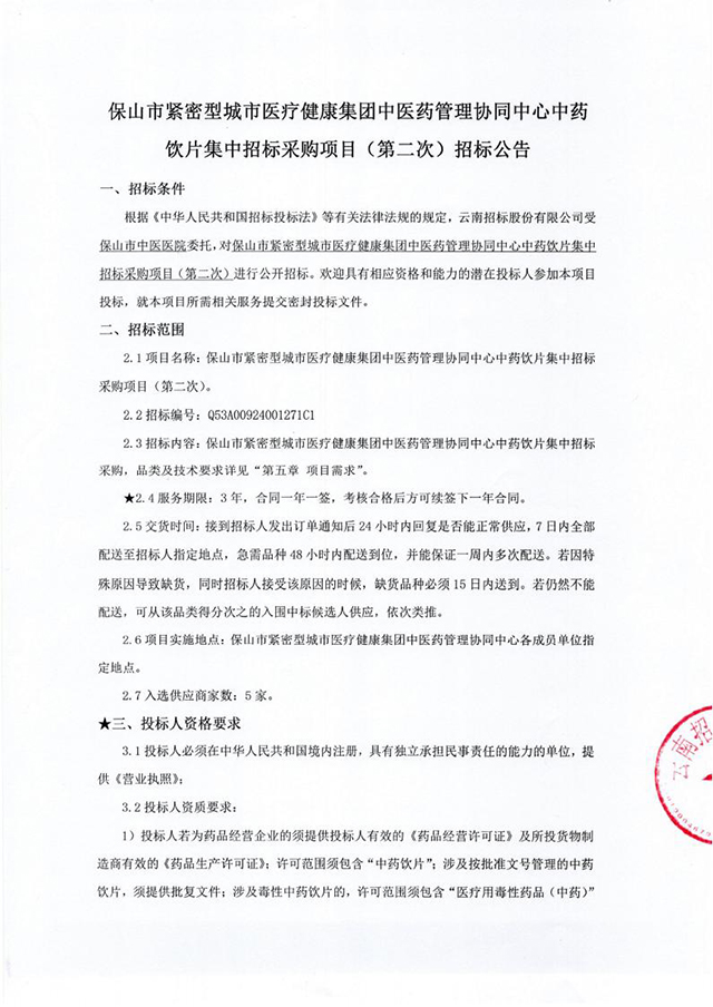 【保山市中医医院】云南省保山市紧密型城市医疗健康集团中医药管理协同中心中药饮片集中招标采购项目(第二次)招标公告