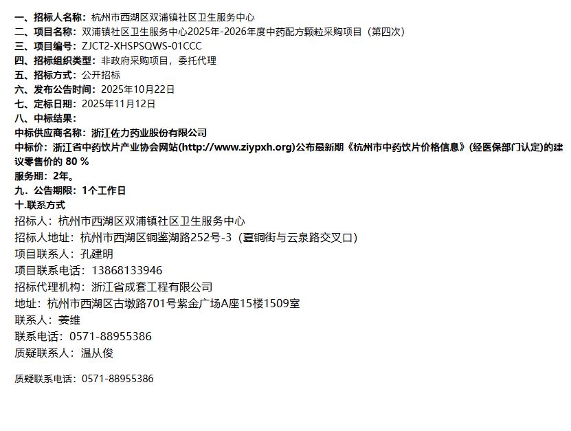 【杭州市西湖区双浦镇社区卫生服务中心】浙江省成套工程有限公司关于双浦镇社区卫生服务中心2025年-2026年度中药配方颗粒采购项目(第四次)的中标结果公告(非政府采购项目)