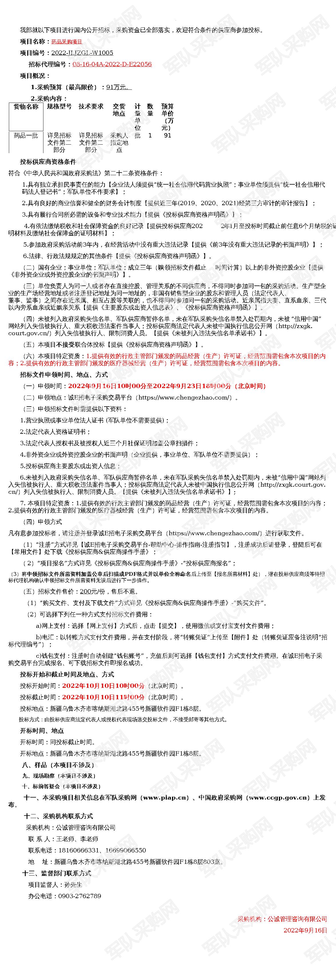 【军队采购网】药品采购项目(2022-JLJZGL-W1005)