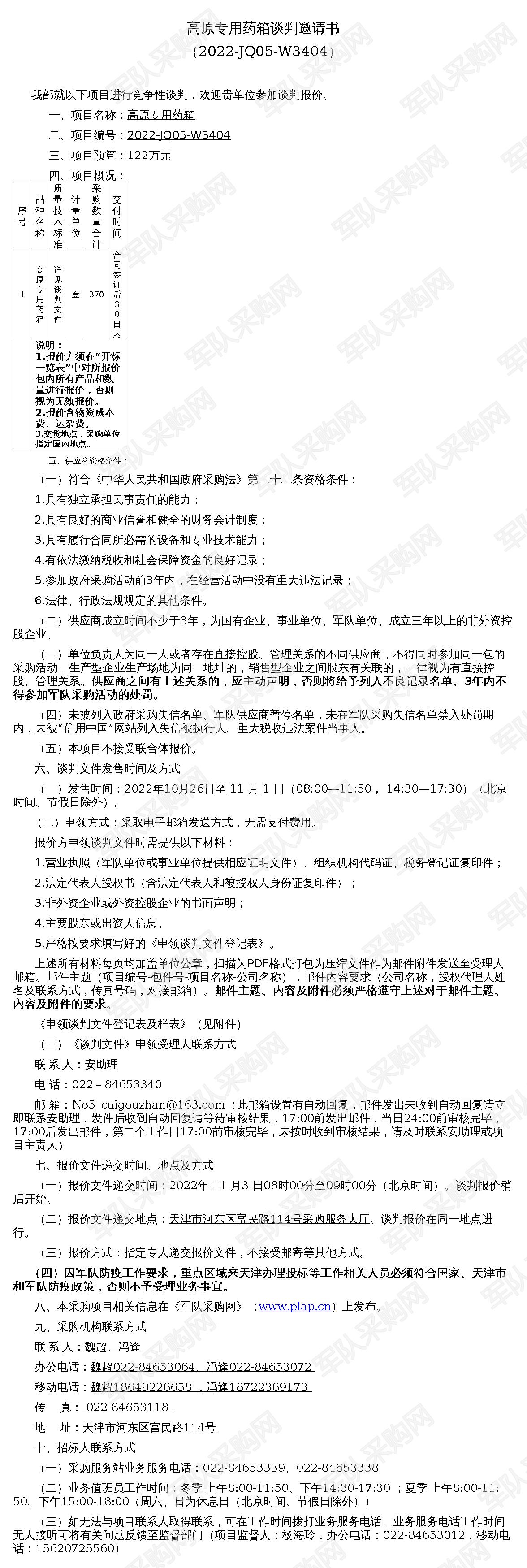 【军队采购网】高原专用药箱谈判邀请书(2022-JQ05-W3404)