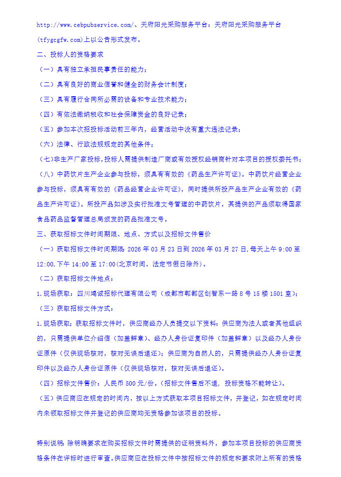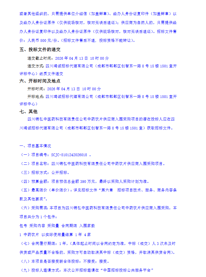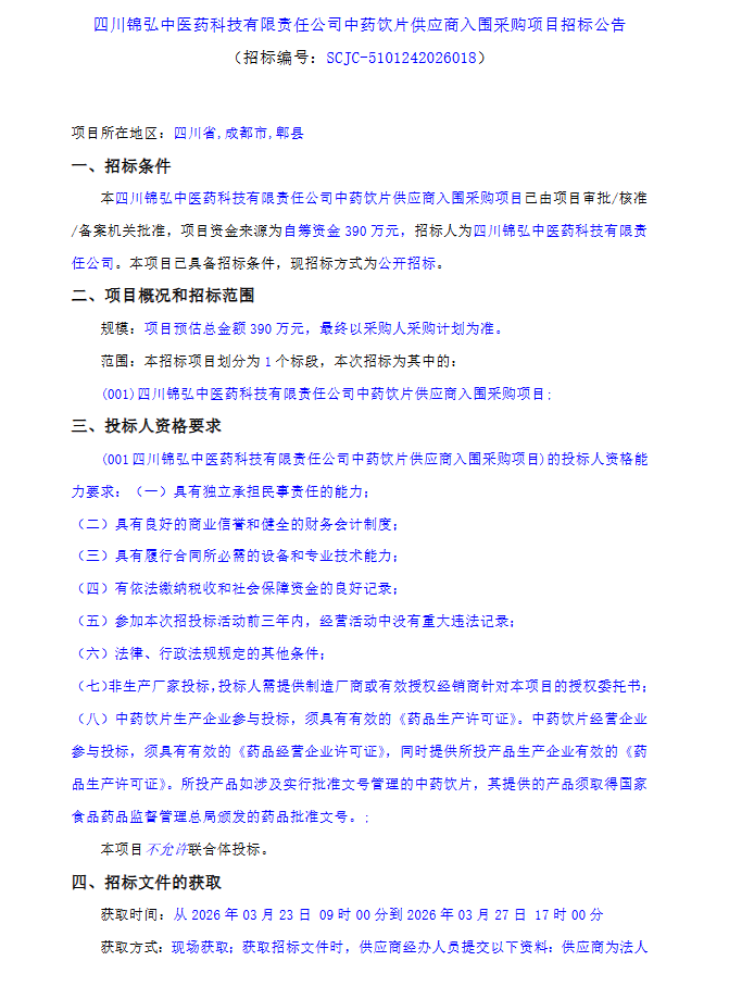 【四川锦弘中医药科技有限责任公司】四川锦弘中医药科技有限责任公司中药饮片供应商入围采购项目招标公告