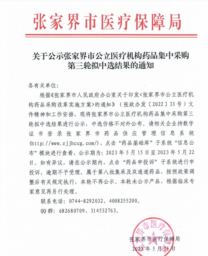 根据《张家界市人民政府办公室关于印发<张家界市公立医疗机构药品采购改革实施方案>的通知》(张政办发〔2022〕33号)文件精神和工作安排,现将张家界市公立医疗机构药品集中采购第三轮拟中选结果进行公示,中选价格不对外公布。请相关企业持数字证书 登录张家界市 药 品供应管理信 息 系 统(http://www.zjjhccg.com/),点击“药品基础库”子系统“信息公布”模块进行查看,公示期为:2023年5月15日至2023年5月22日。如有异议,请在公示期内,点击“药品申投诉”子系统进行申投诉,逾期不予受理。属于第八批集采及双通道药品,按照政策调整后有关规定执行,本轮不再公示。本轮未公示产品,根据临床专家意见再另行处理。
