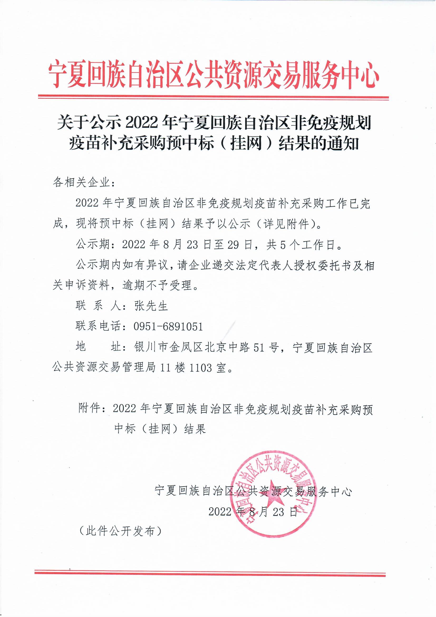 【宁夏】关于公示2022年宁夏回族自治区非免疫规划疫苗补充采购预中标(挂网)结果的通知