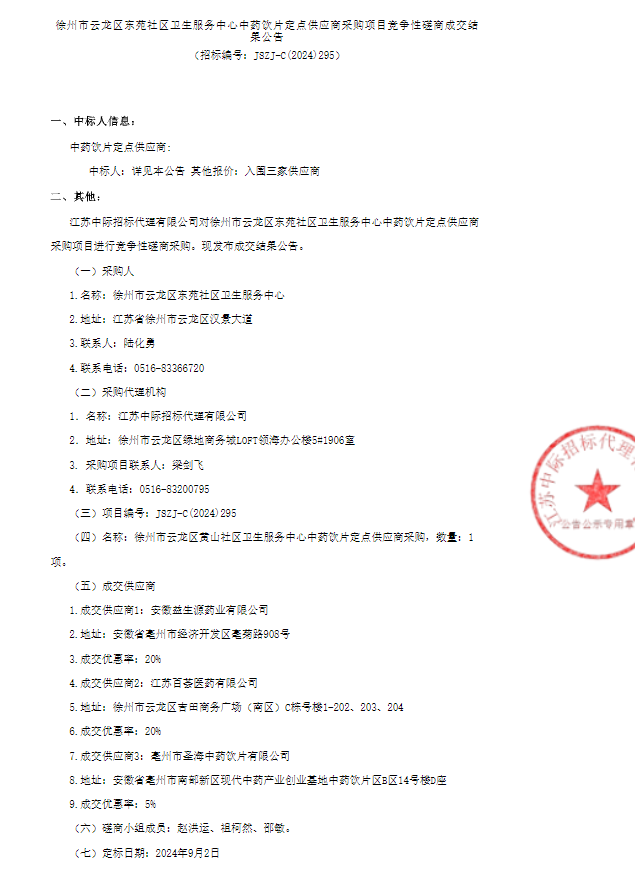 【徐州市云龙区东苑社区卫生服务中心】江苏省徐州市云龙区东苑社区卫生服务中心中药饮片定点供应商采购项目竞争性磋商成交结果公告
