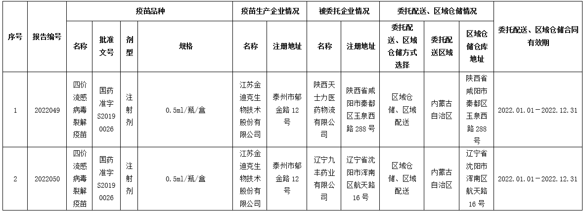 注:江苏金迪克生物技术股份有限公司在内蒙古自治区的原委托企业为国药控股上海有限公司,原委托合同有效期至2022年12月31日结束(见《江苏省药品监督管理局关于江苏省非免疫规划疫苗委托配送和区域仓储情况信息的公告(2021年第9号)》)。现江苏金迪克生物技术股份有限公司自2021年12月15日起提前终止与国药控股上海有限公司的委托业务。