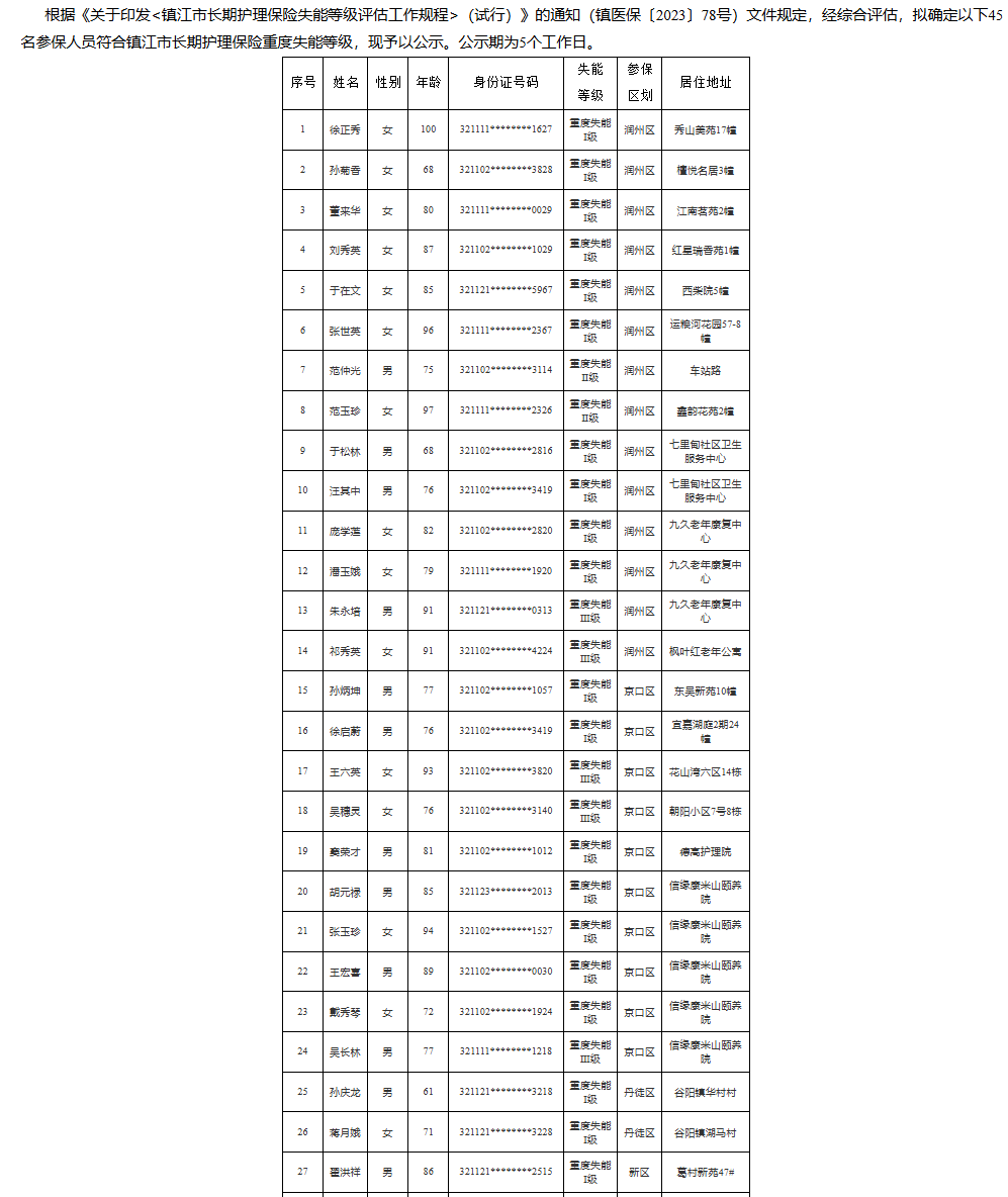 【镇江】2025年度镇江市长期护理保险失能等级评估结论公示(12月第三批)