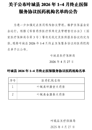 【新疆】关于公布叶城县2026年1-4月终止医保服务协议医药机构名单的公告