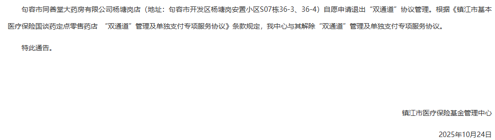【镇江】关于解除1家定点零售药店“双通道”管理及单独支付专项服务协议的通告