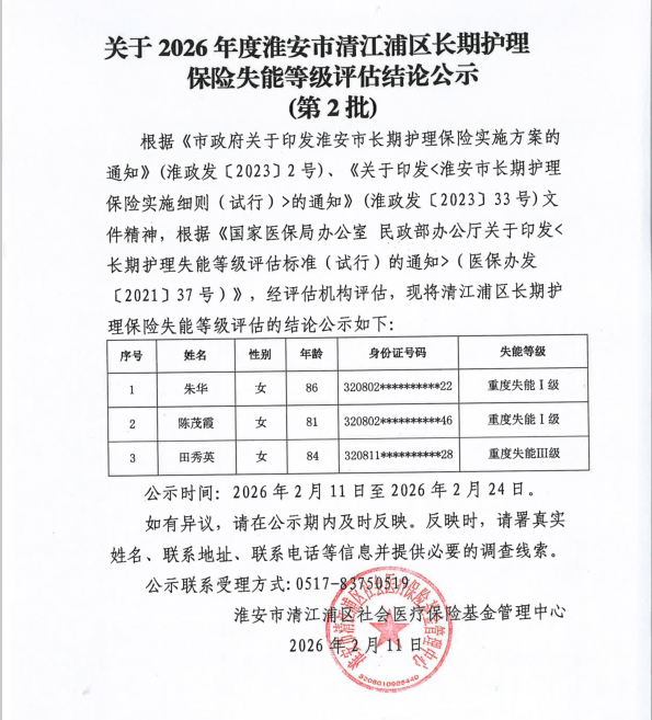 【淮安】关于2026年度淮安市清江浦区长期护理保险失能等级评估结论公示(第2批)