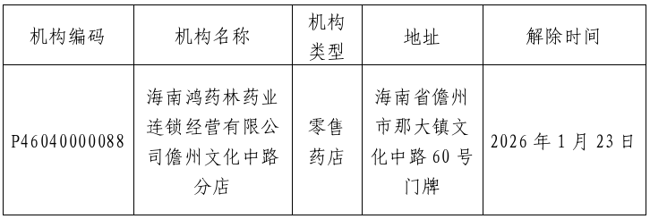 儋州市医疗保险服务中心决定终止医保服务协议的定点药店1家,现将相关信息予以公布(附后)。定点药店医保服务协议解除后产生的医药费用,医疗保障基金不再结算。