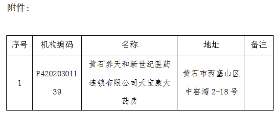 根据《零售药店医疗保障定点管理暂行办法》(国家医疗保障局令第3号)、《湖北省医药机构医疗保障协议管理经办规程》、《湖北省定点零售药店医疗保障服务协议(2025版)》等规定,经机构自主申请,从2026年2月3日起,解除黄石养天和新世纪医药连锁有限公司天宝康大药房定点零售药店服务协议。详情见附件。