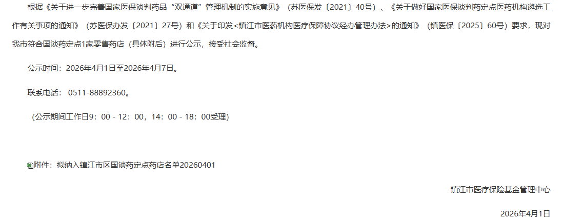 【镇江】镇江市拟纳入国谈药定点零售药店名单公示