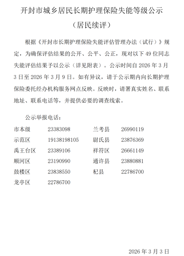 【开封】开封市城乡居民长期护理保险失能等级公示(居民续评)--第72批